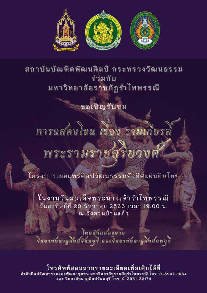 สถาบันบัณฑิตพัฒนศิลป์ กระทรวงวัฒนธรรม ร่วมกับ มหาวิทยาลัยราชภัฏรำไพพรรณี ขอเชิญรับชมการแสดงโขน เรื่อง รามเกียรติ์ พระรามราชสุริยวงศ์