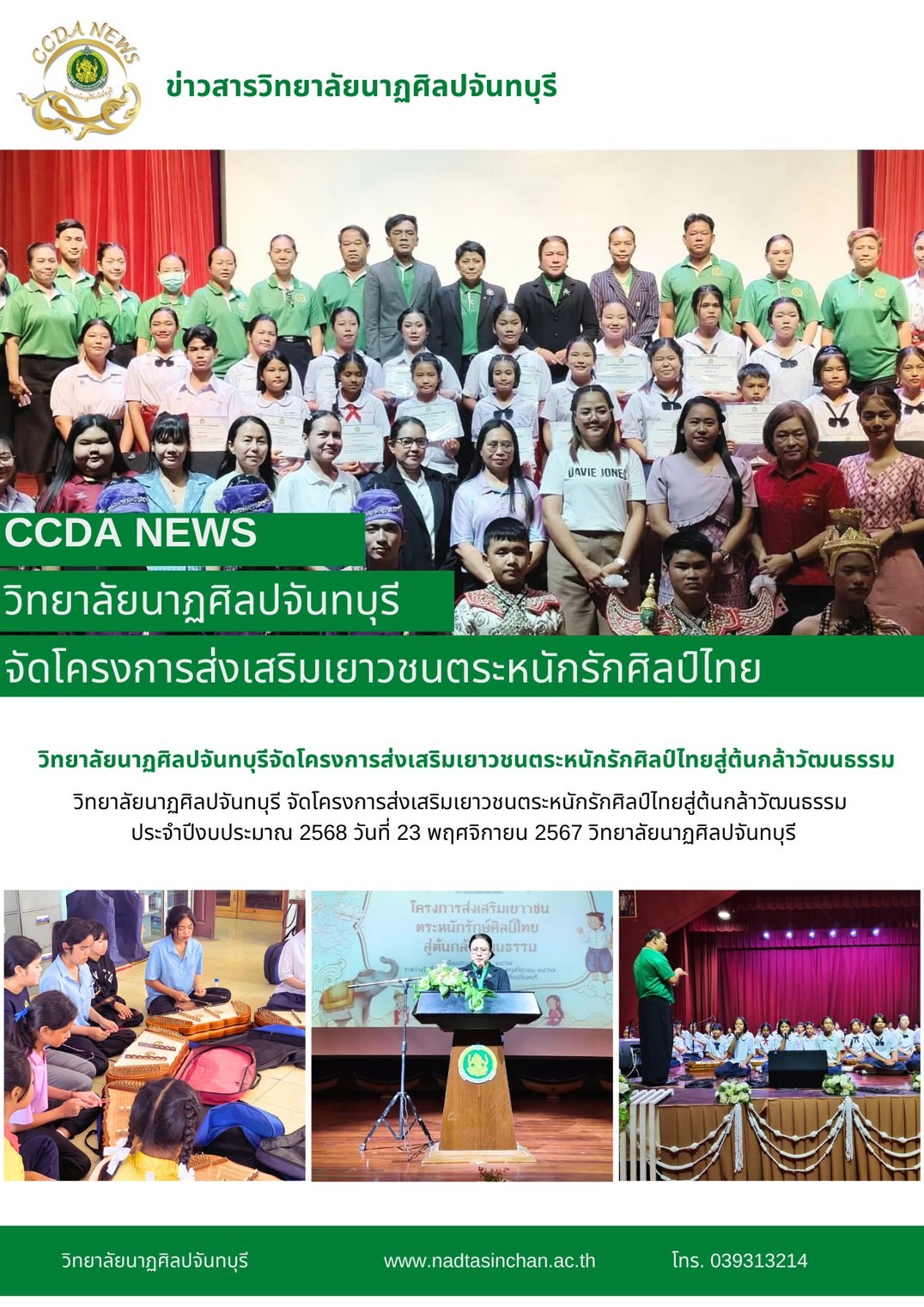 วิทยาลัยนาฏศิลปจันทบุรี จัดโครงการส่งเสริมเยาวชนตระหนักรักศิลป์ไทยสู่ต้นกล้าวัฒนธรรม