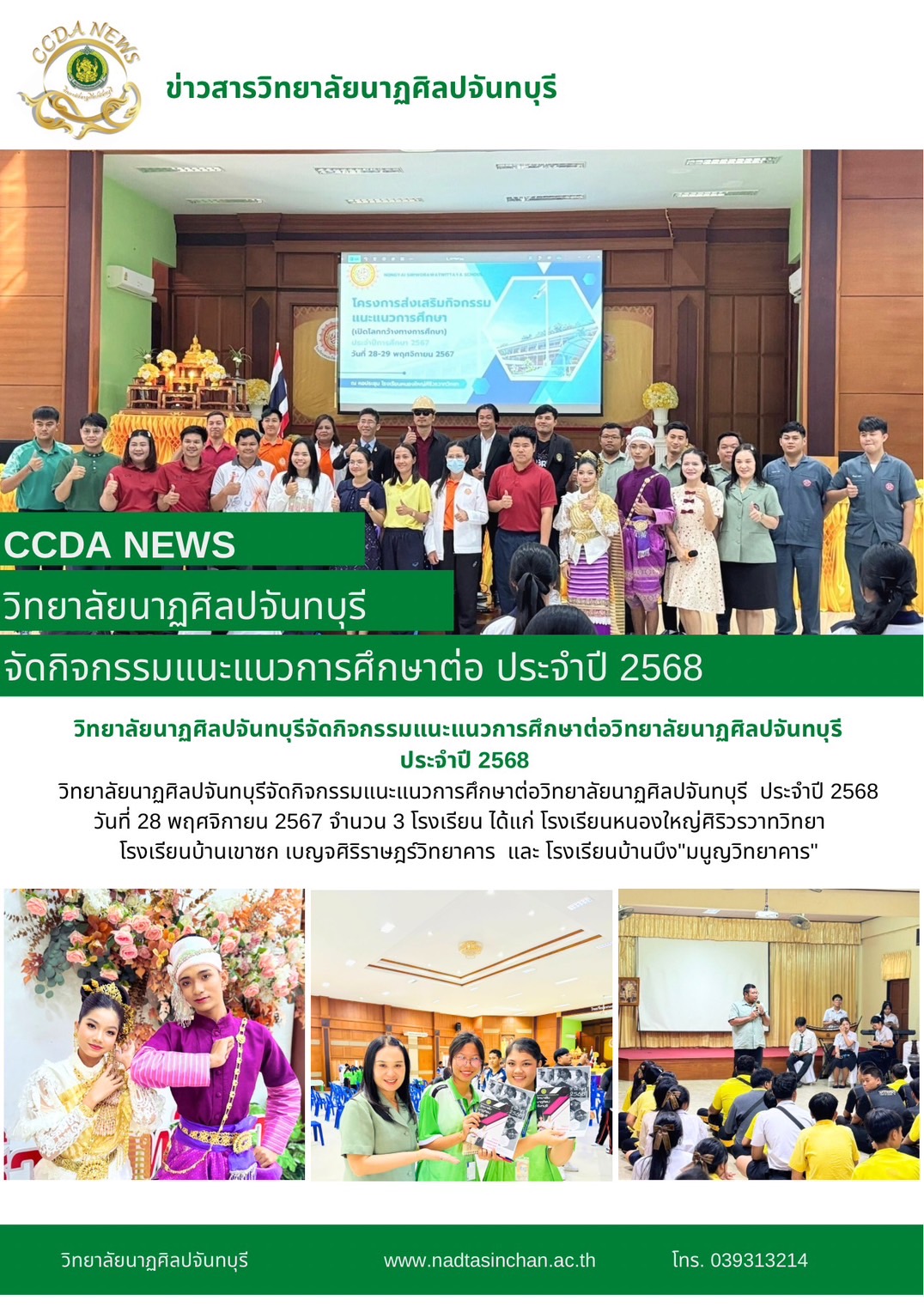 วิทยาลัยนาฏศิลปจันทบุรีจัดกิจกรรมแนะแนวการศึกษาต่อวิทยาลัยนาฏศิลปจันทบุรี ประจำปี 2568 วันที่ 28 พฤศจิกายน 2567 จำนวน 3 โรงเรียน ได้แก่ โรงเรียนหนองใหญ่ศิริวรวาทวิทยา โรงเรียนบ้านเขาซก เบญจศิริราษ
