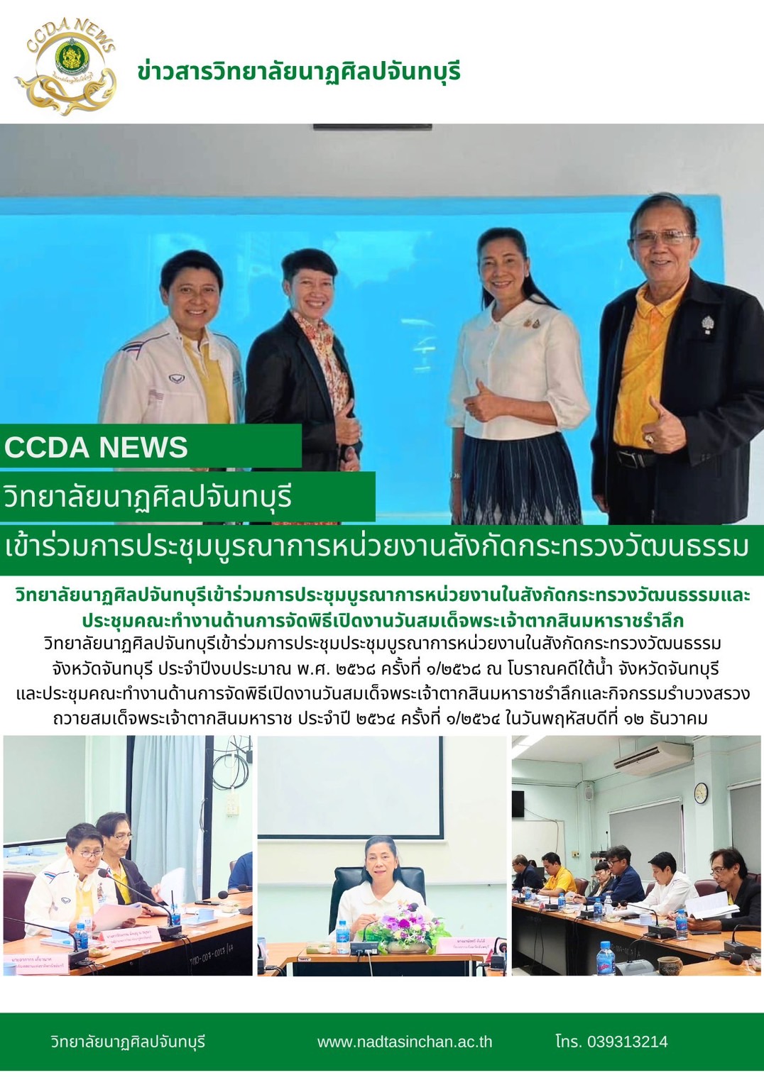 วิทยาลัยนาฏศิลปจันทบุรีเข้าร่วมประชุมบูรณาการหน่วยงานในสังกัดกระทรวงวัฒนธรรม จังหวัดจันทบุรี ประจำปีงบประมาณ พ.ศ. ๒๕๖๘ ครั้งที่ ๑/๒๕๖๘ ณ โบราณคดีใต้น้ำ จังหวัดจันทบุรี และช่วงบ่ายประชุมคณะทำงานด้านการ