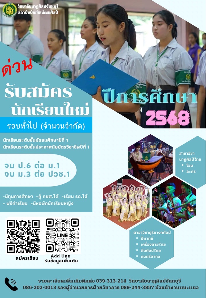 วิทยาลัยนาฏศิลปจันทบุรีประกาศรับสมัครนักเรียนเพื่อศึกษาต่อในระดับชั้นมัธยมศึกษาปีที่ 1