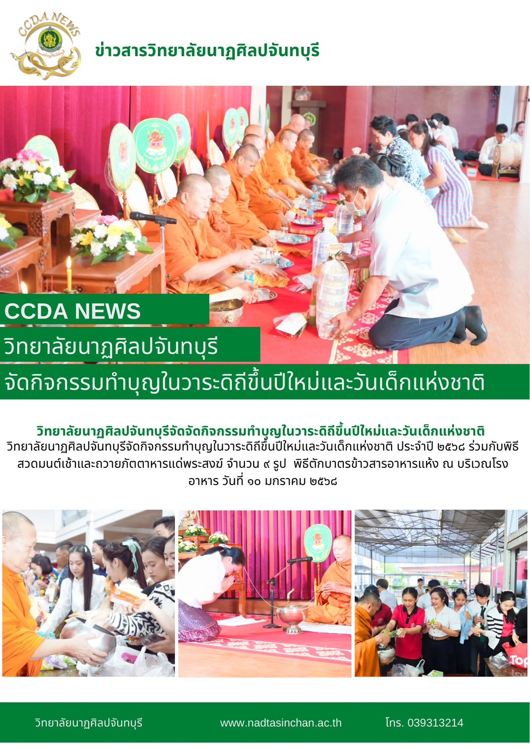 วิทยาลัยนาฏศิลปจันทบุรีจัดกิจกรรมทำบุญในวาระดิถีขึ้นปีใหม่และวันเด็กแห่งชาติ ประจำปี ๒๕๖๘ ร่วมกับพิธีสวดมนต์เช้าและถวายภัตตาหารแด่พระสงฆ์ จำนวน ๙ รูป พิธีตักบาตรข้าวสารอาหารแห้ง ณ บริเวณโรงอาหาร วันที่ ๑๐ มกราคม ๒๕๖๘