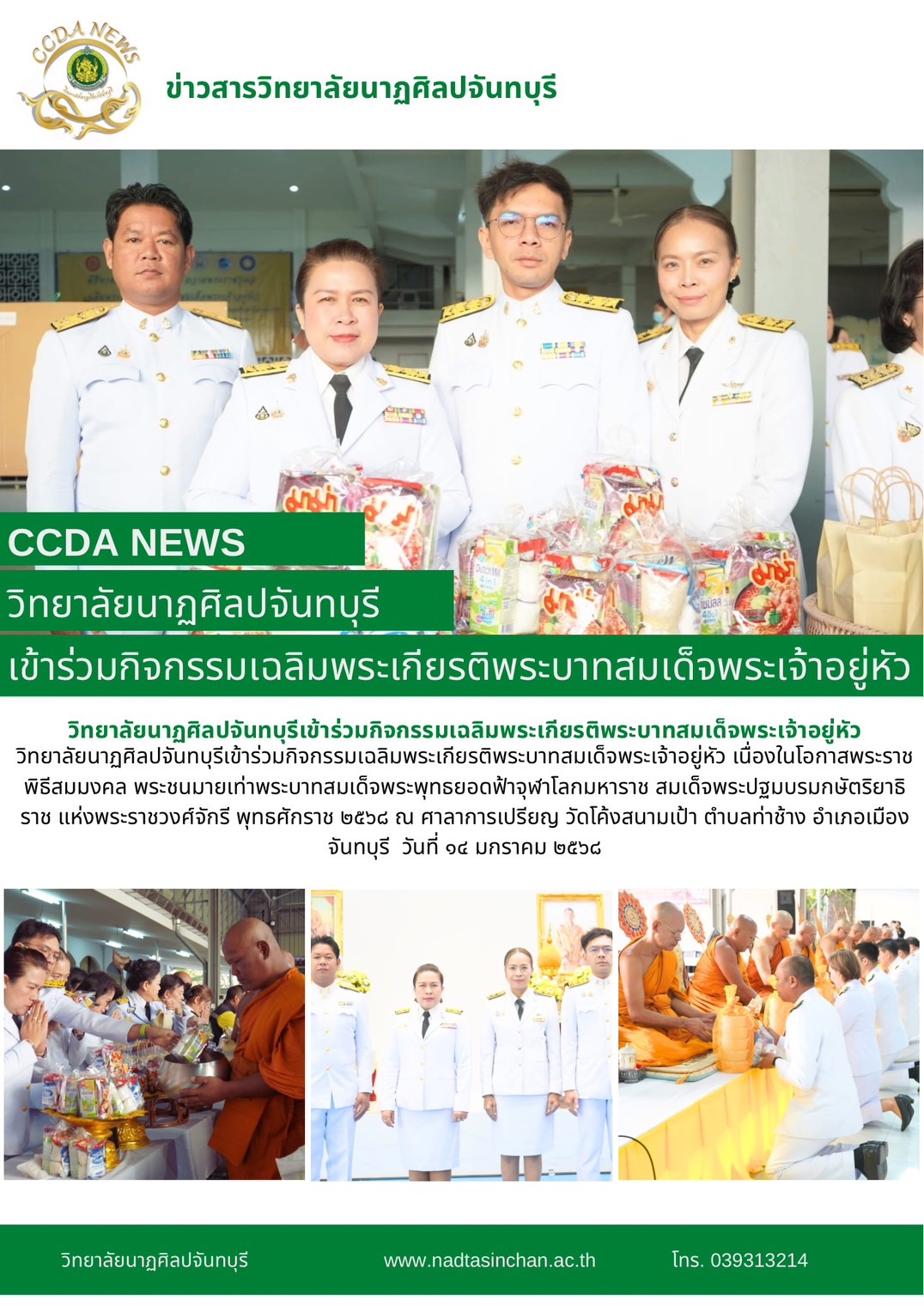 วิทยาลัยนาฏศิลปจันทบุรีเข้าร่วมกิจกรรมเฉลิมพระเกียรติพระบาทสมเด็จพระเจ้าอยู่หัว เนื่องในโอกาสพระราชพิธีสมมงคล พระชนมายเท่าพระบาทสมเด็จพระพุทธยอดฟ้าจุฬาโลกมหาราช สมเด็จพระปฐมบรมกษัตริยาธิราช แห่งพระราชวงศ์จักรี พุทธศักราช ๒๕๖๘ ณ ศาลาการเปรียญ วัดโค้งสนามเป้า ตำบลท่าช้าง อำเภอเมืองจันทบุรี วันที่ ๑๔ มกราคม ๒๕๖๘