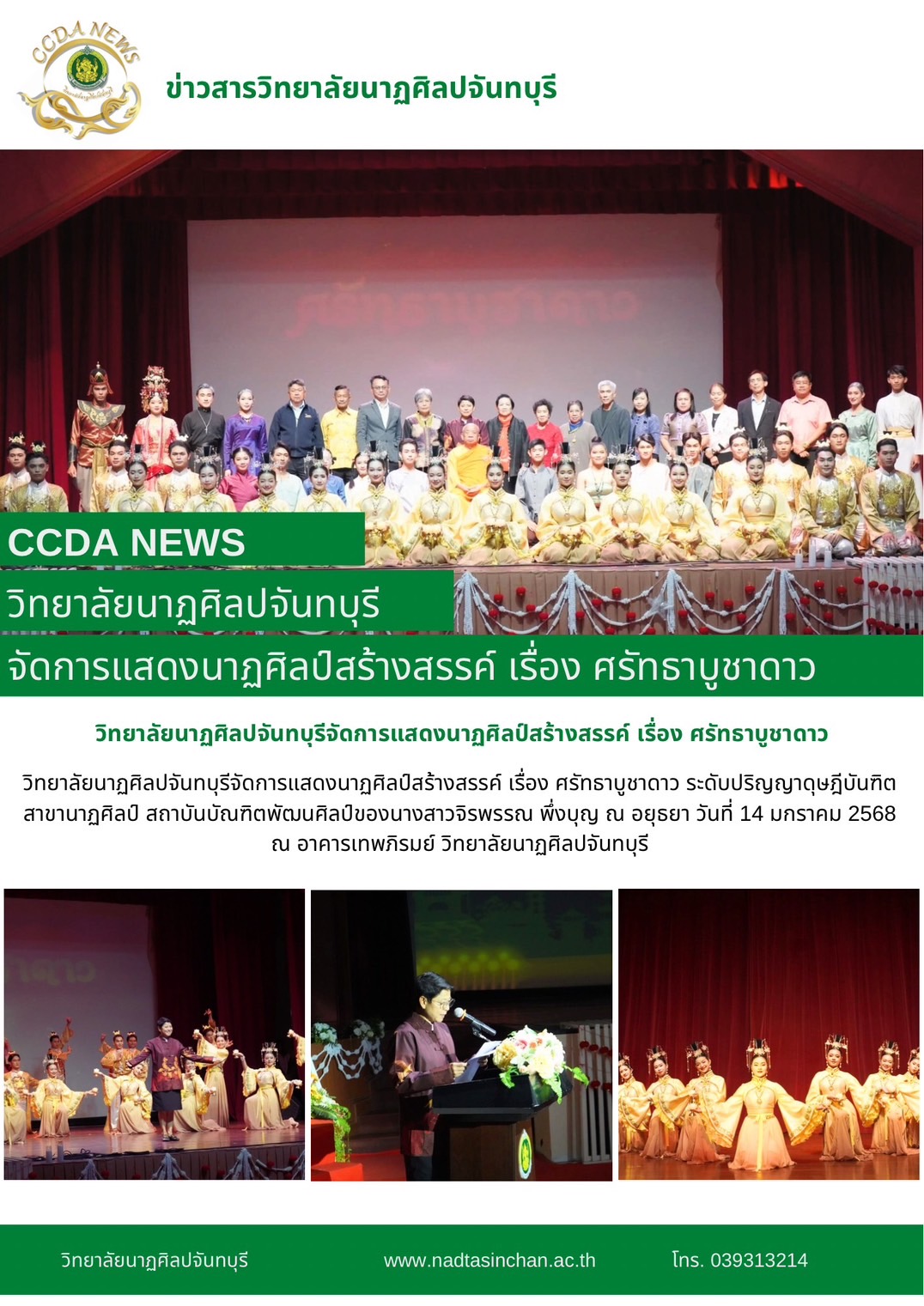 วิทยาลัยนาฏศิลปจันทบุรีจัดการแสดงนาฏศิลป์สร้างสรรค์ เรื่อง ศรัทธาบูชาดาว ระดับปริญญาดุษฎีบันฑิต สาขานาฏศิลป์ สถาบันบัณฑิตพัฒนศิลป์ของนางสาวจิรพรรณ พึ่งบุญ ณ อยุธยา วันที่ 14 มกราคม 2568 ณ อาคารเทพภิร