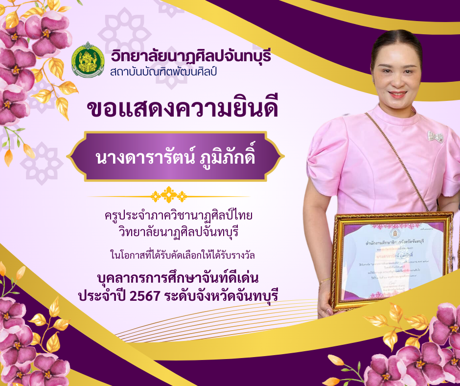 วิทยาลัยนาฏศิลปจันทบุรี สถาบันบัณฑิตพัฒนศิลป์ ขอแสดงความยินดี ?นางดารารัตน์ ภูมิภักดิ์? ครูประจำภาควิชานาฏศิลป์ไทย วิทยาลัยนาฏศิลปจันทบุรี ในโอกาสที่ได้รับคัดเลือกให้ได้รับรางวัล ?บุคลากรการศึกษาจันท์
