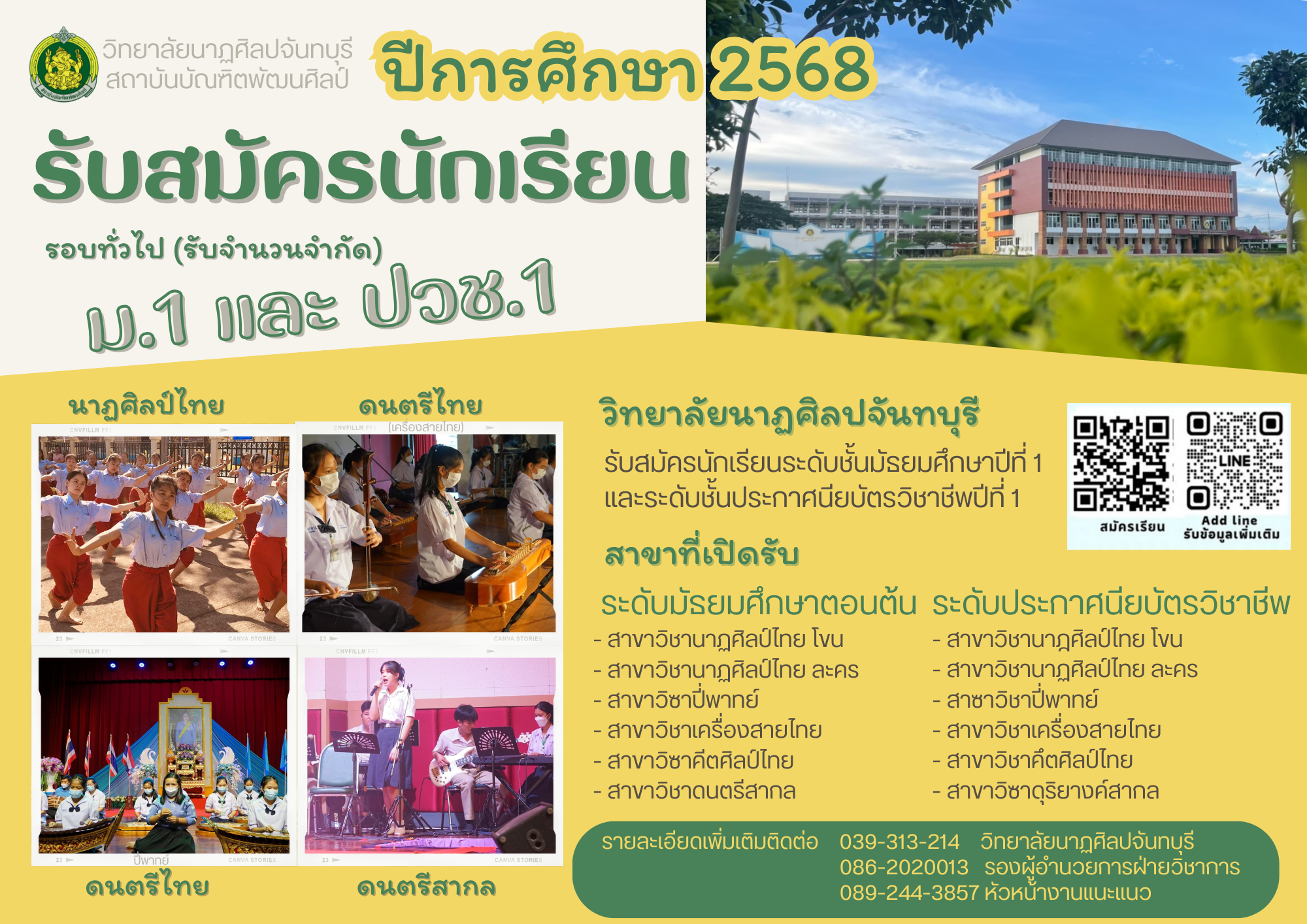 ?วิทยาลัยนาฏศิลปจันทบุรีประกาศรับสมัครนักเรียนเพื่อศึกษาต่อในระดับชั้นมัธยมศึกษาปีที่ 1 และระดับชั้นประกาศนียบัตรวิชาชีพปีที่ 1 ปีการศึกษา ๒๕๖๘