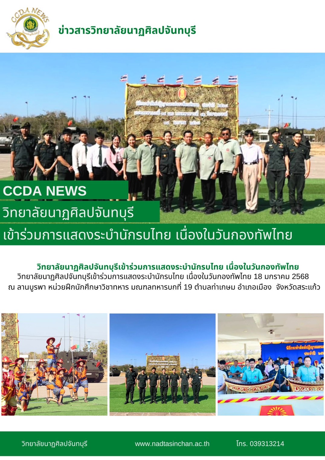 วิทยาลัยนาฏศิลปจันทบุรีเข้าร่วมการแสดงระบำนักรบไทย เนื่องในวันกองทัพไทย 18 มกราคม 2568 ณ ลานบูรพา หน่วยฝึกนักศึกษาวิชาทหาร มณฑลทหารบกที่ 19 ตำบลท่าเกษม อำเภอเมือง  จังหวัดสระแก้ว