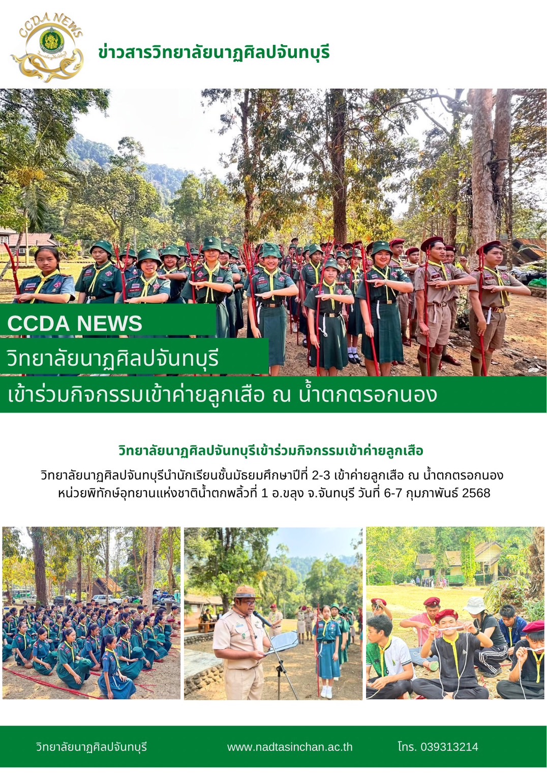 วิทยาลัยนาฏศิลปจันทบุรีเข้าร่วมกิจกรรมลูกเสือ ณ น้ำตกตรอกนอง หน่วยพิทักษ์อุทยานแห่งชาติน้ำตกพลิ้วที่ 1? อ.ขลุง จ.จันทบุรี วันที่ 6-7 กุมภาพันธ์ 2568