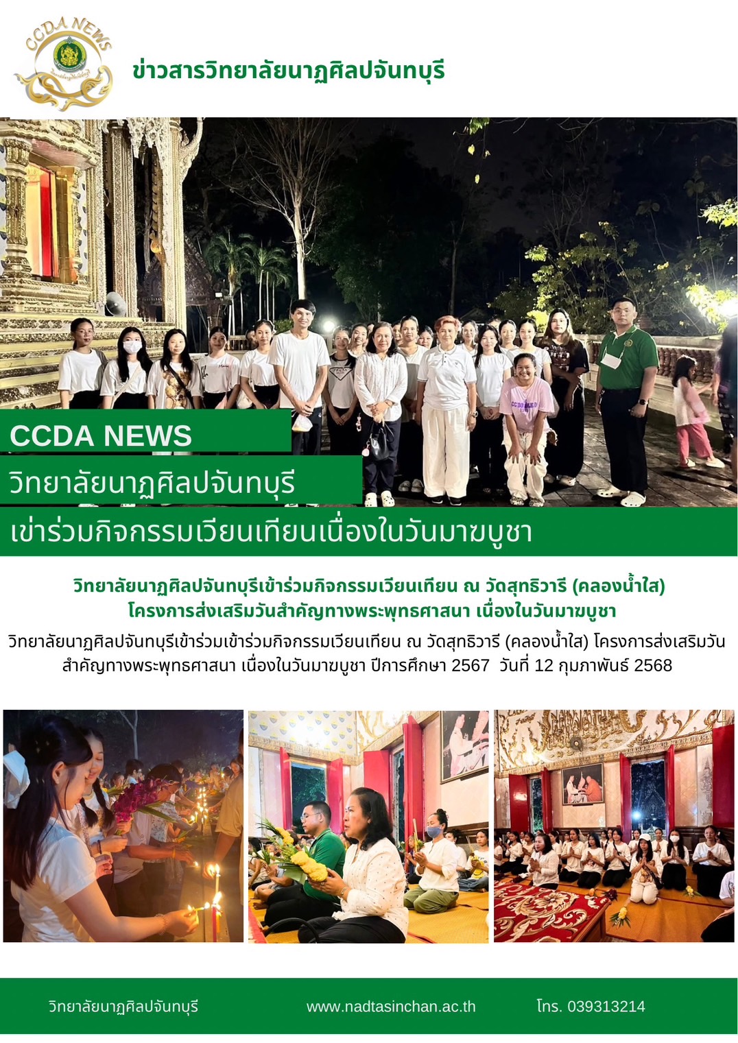 วิทยาลัยนาฏศิลปจันทบุรีเข้าร่วมกิจกรรมเวียนเทียน ณ วัดสุทธิวารี (คลองน้ำใส) โครงการส่งเสริมวันสำคัญทางพระพุทธศาสนา เนื่องในวันมาฆบูชา ปีการศึกษา 2567  วันที่ 12 กุมภาพันธ์ 2568