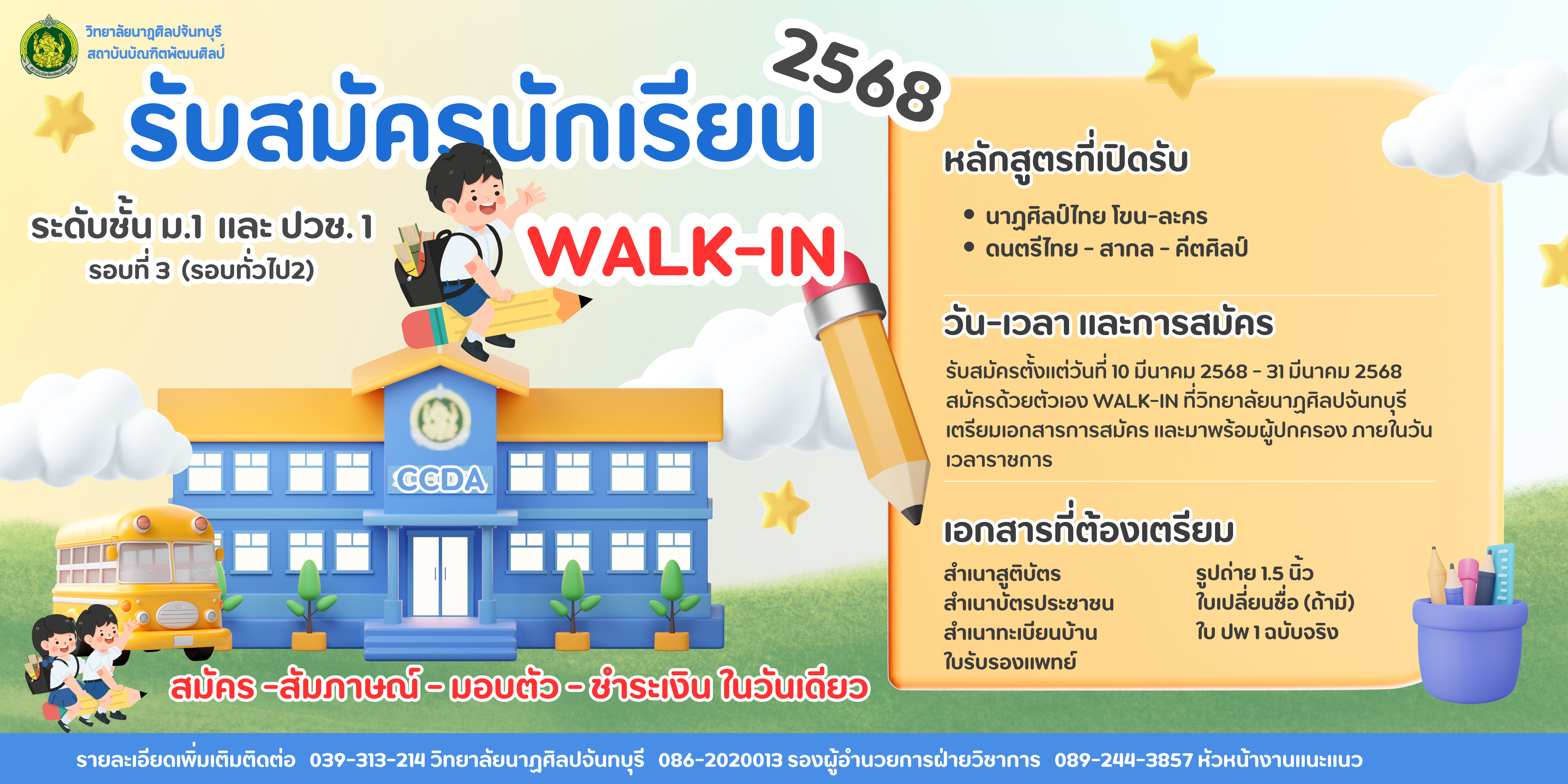 รับสมัครตั้งแต่วันที่ 10 มีนาคม 2568 - 31 มีนาคม 2568 สมัครด้วยตัวเอง walk-in ที่วิทยาลัยนาฏศิลปจันทบุรี เตรียมเอกสารการสมัคร และมาพร้อมผู้ปกครอง ภายในวันเวลาราชการ
