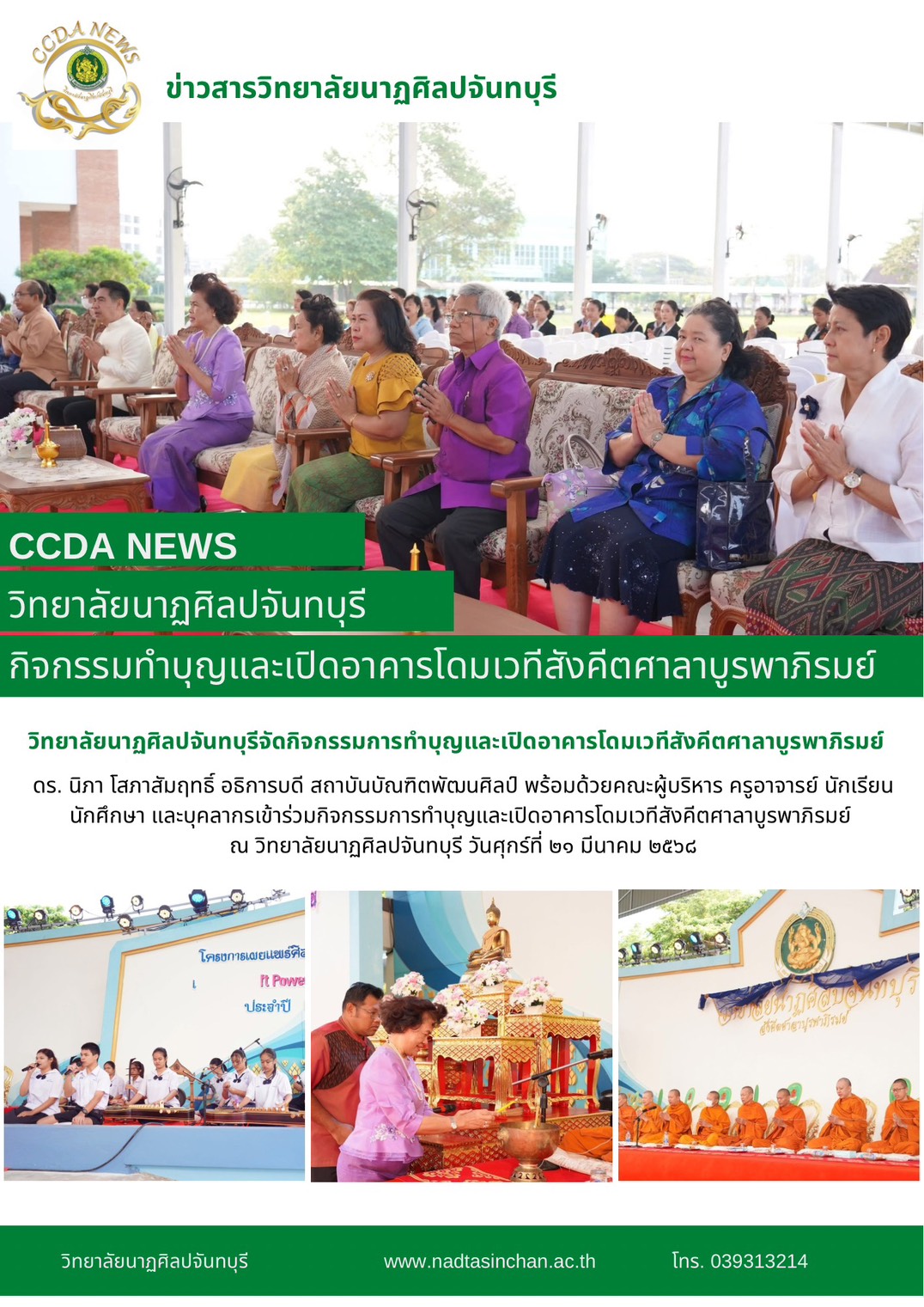 ดร. นิภา โสภาสัมฤทธิ์ อธิการบดี สถาบันบัณฑิตพัฒนศิลป์ พร้อมด้วยคณะผู้บริหาร ครูอาจารย์ นักเรียน นักศึกษา และบุคลากรเข้าร่วมกิจกรรมการทำบุญและเปิดอาคารโดมเวทีสังคีตศาลาบูรพาภิรมย์ ณ วิทยาลัยนาฏศิลปจันทบุรี วันศุกร์ที่ ๒๑ มีนาคม ๒๕๖๘