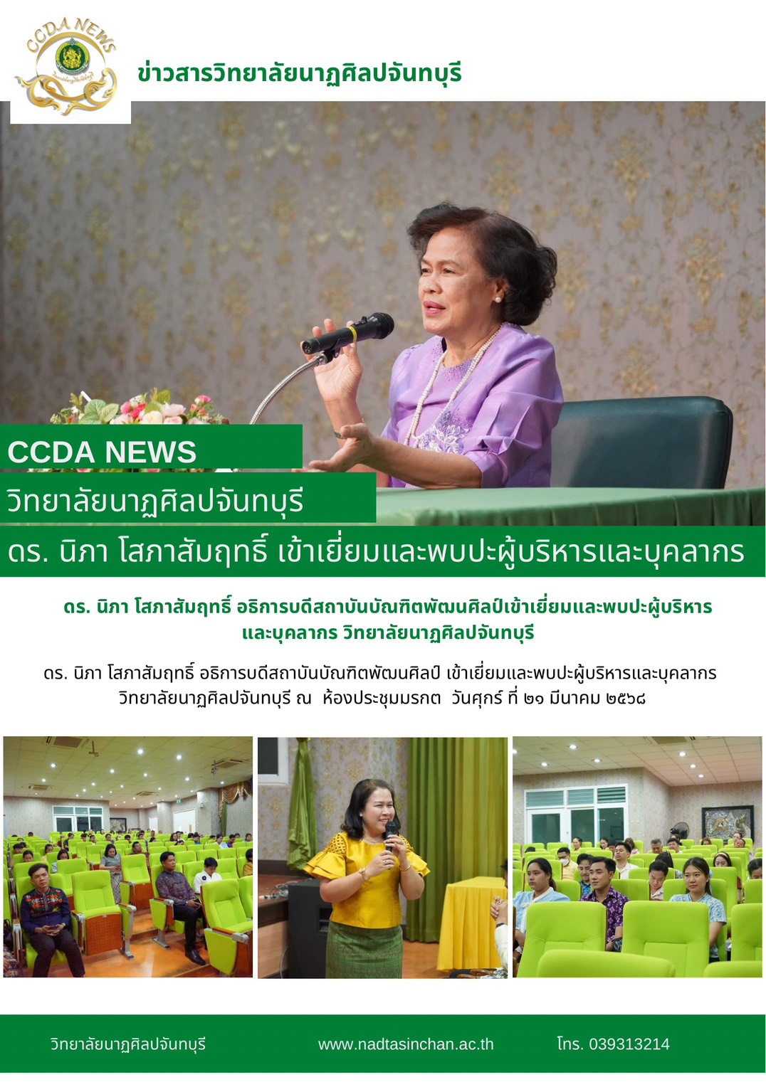 ดร. นิภา โสภาสัมฤทธิ์ อธิการบดีสถาบันบัณฑิตพัฒนศิลป์ เข้าเยี่ยมและพบปะผู้บริหารและบุคลากร วิทยาลัยนาฏศิลปจันทบุรี ณ ห้องประชุมมรกต วันศุกร์ ที่ ๒๑ มีนาคม ๒๕๖๘