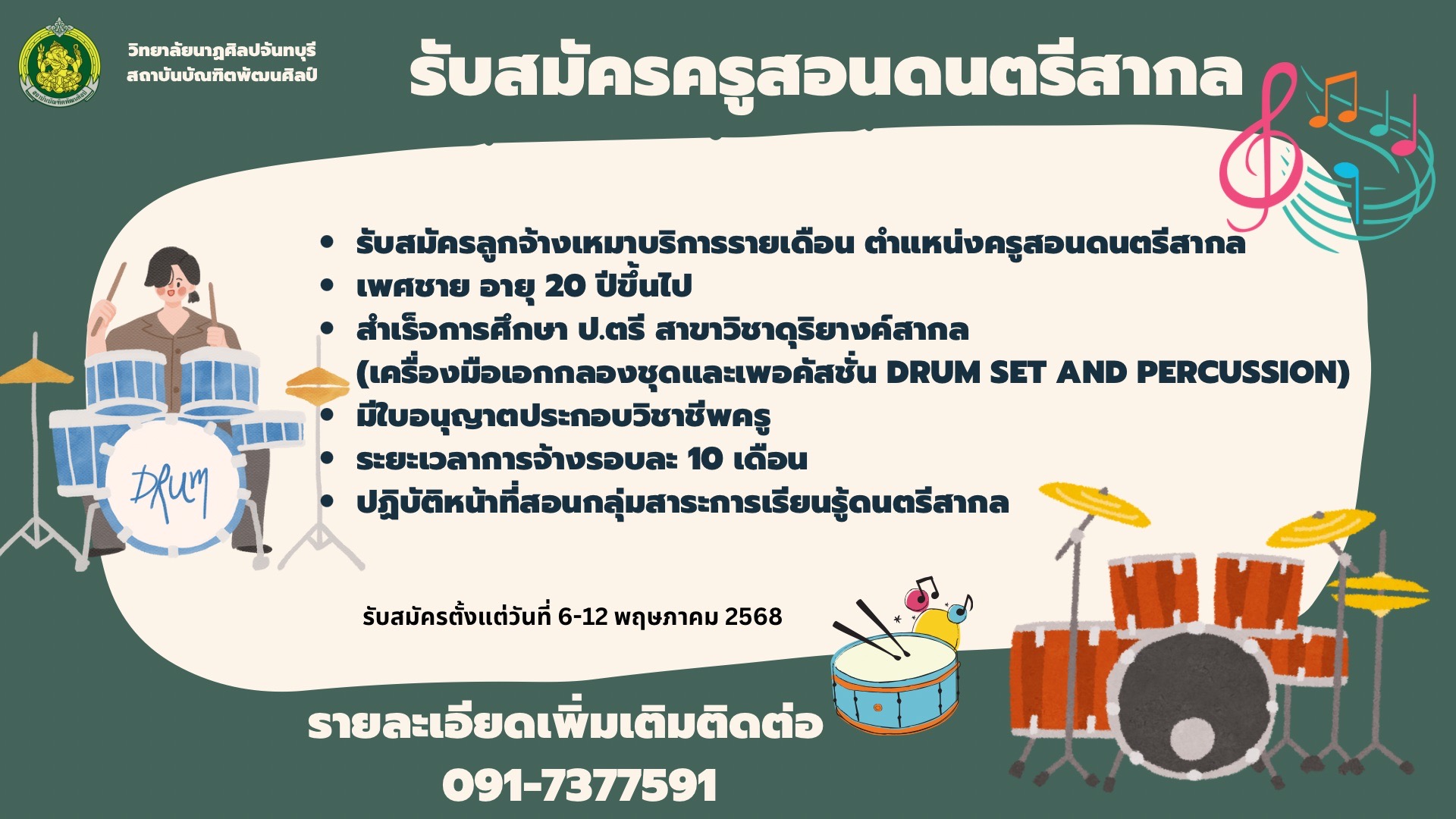 รับสมัครลูกจ้างเหมาบริการรายเดือน ตำแหน่งครูสอนดนตรีสากล