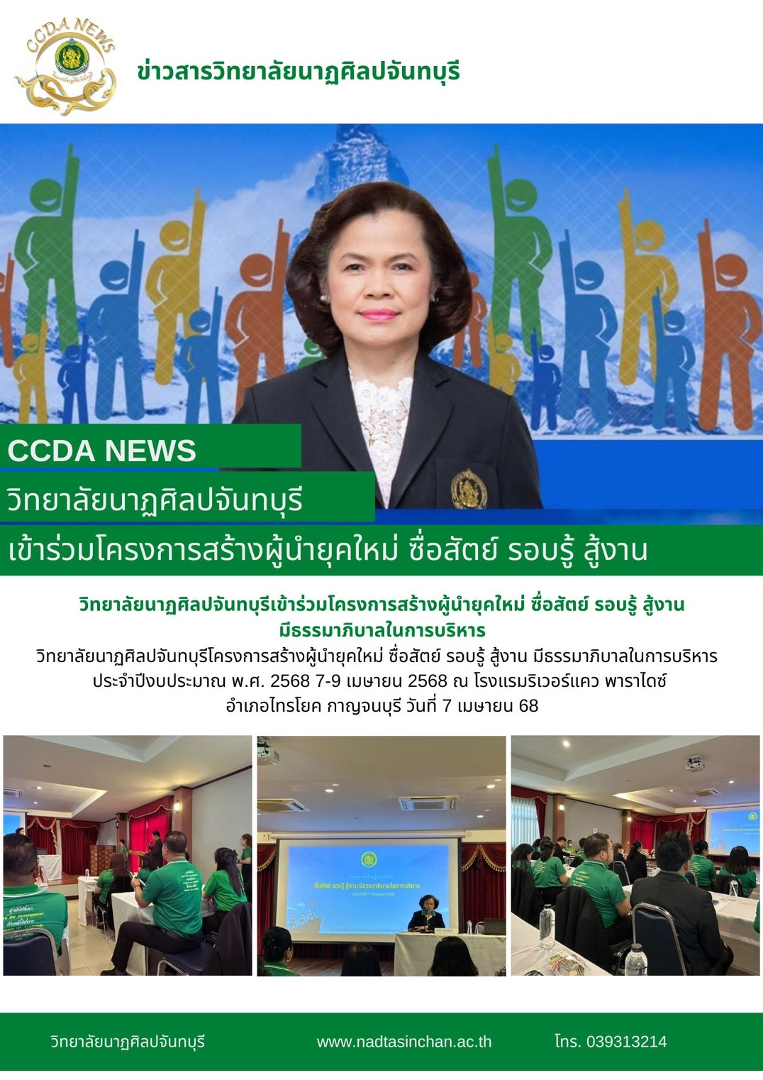 วิทยาลัยนาฏศิลปจันทบุรีเข้าร่วมโครงการสร้างผู้นำยุคใหม่ ซื่อสัตย์ รอบรู้ สู้งาน มีธรรมาภิบาลในการบริหาร ประจำปีงบประมาณ พ.ศ. 2568 7-9 เมษายน 2568