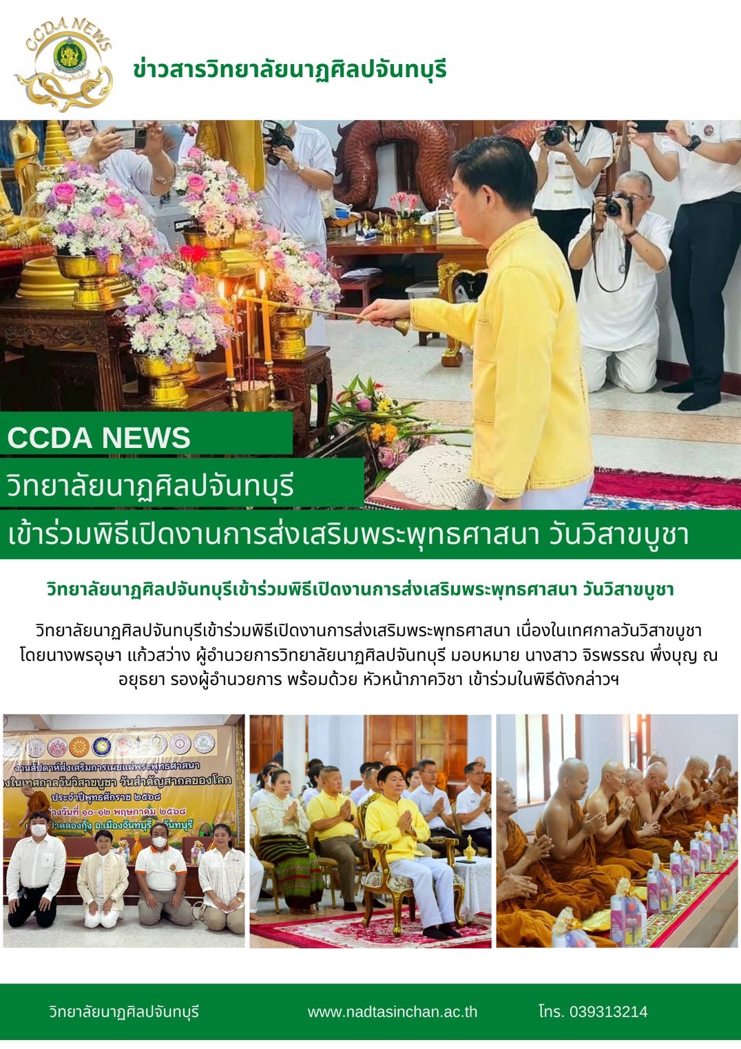 โดยนางพรอุษา แก้วสว่าง ผู้อำนวยการวิทยาลัยนาฏศิลปจันทบุรี มอบหมาย นางสาว จิรพรรณ พึ่งบุญ ณ อยุธยา รองผู้อำนวยการ พร้อมด้วย หัวหน้าภาควิชา เข้าร่วมในพิธีดังกล่าวฯ