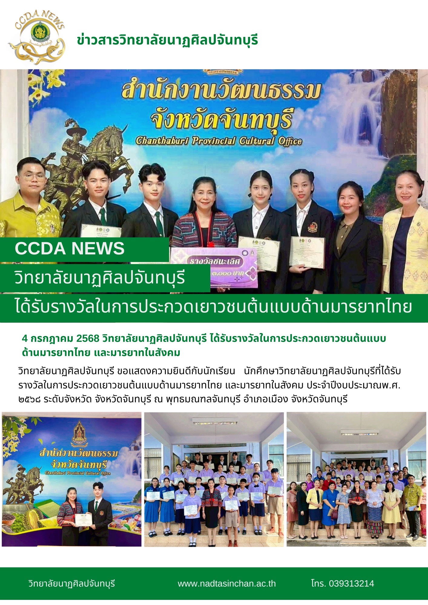วิทยาลัยนาฏศิลปจันทบุรี ขอแสดงความยินดีกับนักเรียน นักศึกษาวิทยาลัยนาฏศิลปจันทบุรีที่ได้รับรางวัลในการประกวดเยาวชนต้นแบบด้านมารยาทไทย และมารยาทในสังคม ประจำปีงบประมาณพ.ศ. ๒๕๖๘ ระดับจังหวัด จังหวัดจันทบุรี ณ พุทธมณฑลจันทบุรี อำเภอเมือง จังหวัดจันทบุรี