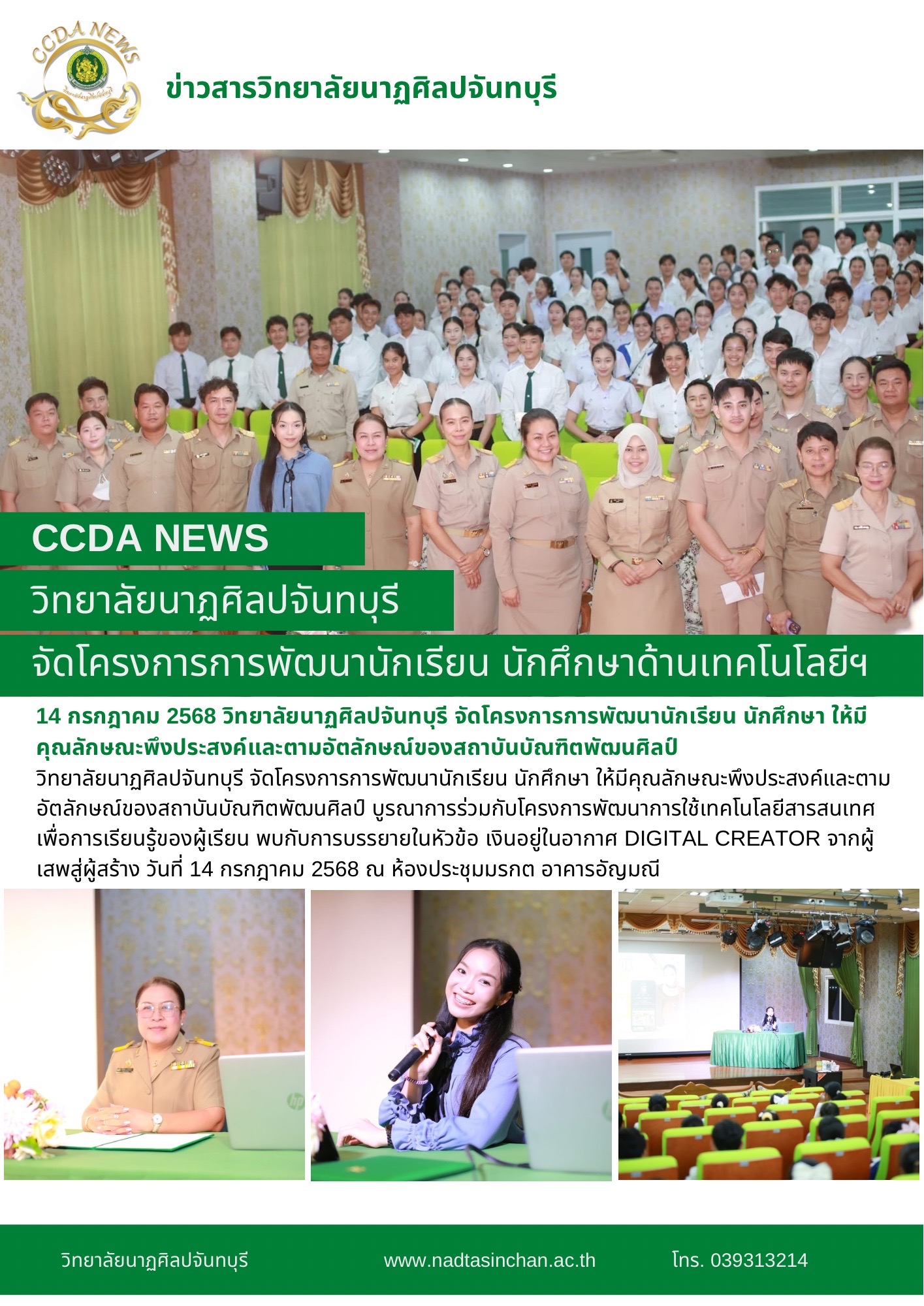 วิทยาลัยนาฏศิลปจันทบุรี จัดโครงการการพัฒนานักเรียน นักศึกษา ให้มีคุณลักษณะพึงประสงค์และตามอัตลักษณ์ของสถาบันบัณฑิตพัฒนศิลป์ บูรณาการร่วมกับโครงการพัฒนาการใช้เทคโนโลยีสารสนเทศ เพื่อการเรียนรู้ของผู้เรียน พบกับการบรรยายในหัวข้อ เงินอยู่ในอากาศ DIGITAL CREATOR จากผู้เสพสู่ผู้สร้าง วันที่14 กรกฎาคม 2568 ณ ห้องประชุมมรกต อาคารอัญมณี
