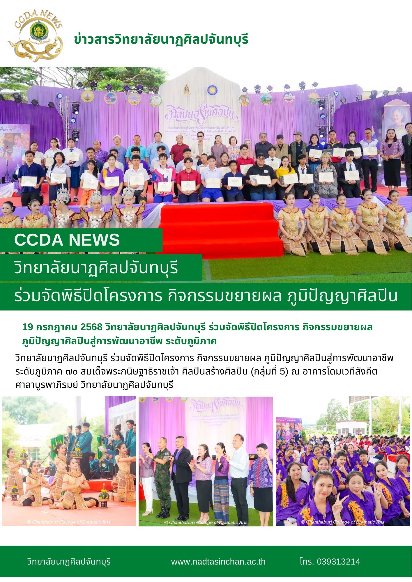 วิทยาลัยนาฏศิลปจันทบุรี ร่วมจัดพิธีปิดโครงการ กิจกรรมขยายผล ภูมิปัญญาศิลปินสู่การพัฒนาอาชีพ ระดับภูมิภาค ๗๐ สมเด็จพระกนิษฐาธิราชเจ้า ศิลปินสร้างศิลปิน (กลุ่มที่ 5)