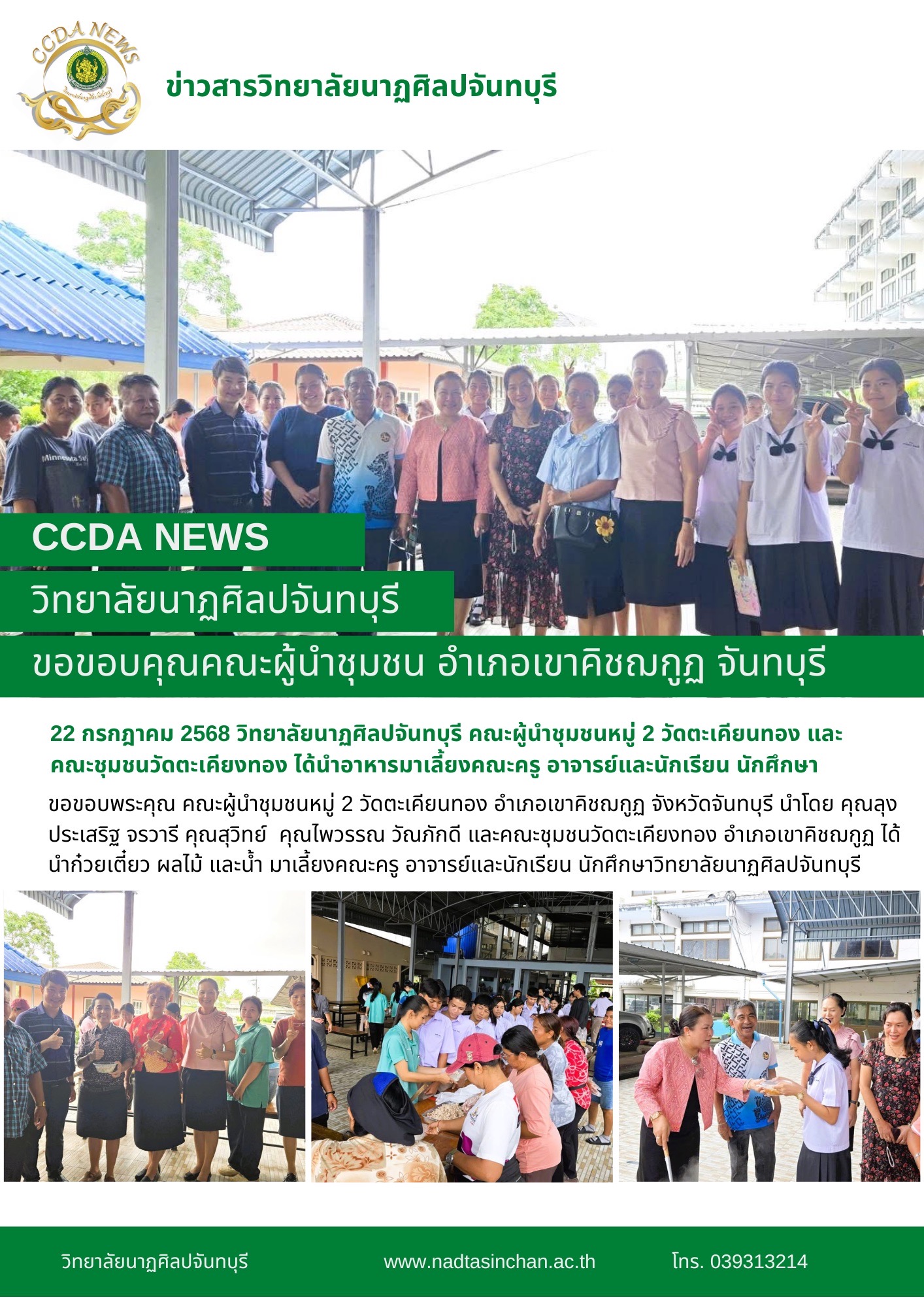 วิทยาลัยนาฏศิลปจันทบุรีขอขอบพระคุณ คณะผู้นำชุมชนหมู่ 2 วัดตะเคียนทอง อำเภอเขาคิชฌกูฏ จังหวัดจันทบุรี นำโดย คุณลุงประเสริฐ จรวารี คุณสุวิทย์  คุณไพวรรณ วัณภักดี และคณะชุมชนวัดตะเคียงทอง อำเภอเขาคิชฌกูฏ ได้นำก๋วยเตี๋ยว ผลไม้ และน้ำ มาเลี้ยงคณะครู อาจารย์และนักเรียน นักศึกษาวิทยาลัยนาฏศิลปจันทบุรี