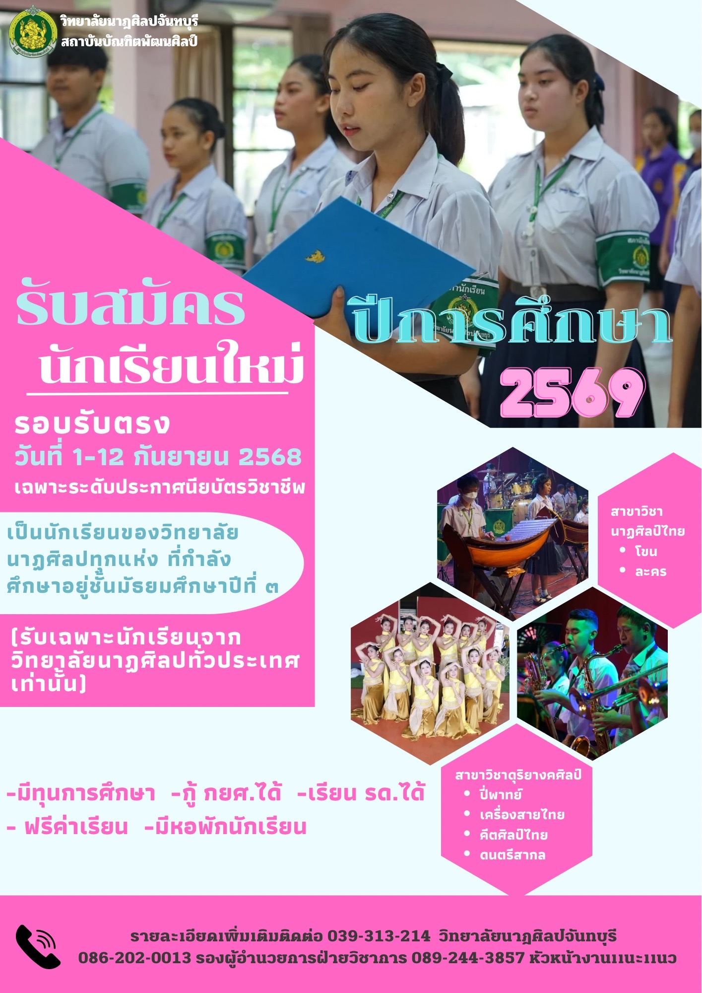 วิทยาลัยนาฏศิลปจันทบุรีประกาศรับสมัครนักเรียนเพื่อศึกษาต่อในระดับชั้นประกาศนียบัตรวิชาชีพปีที่ 1 ปีการศึกษา 2569