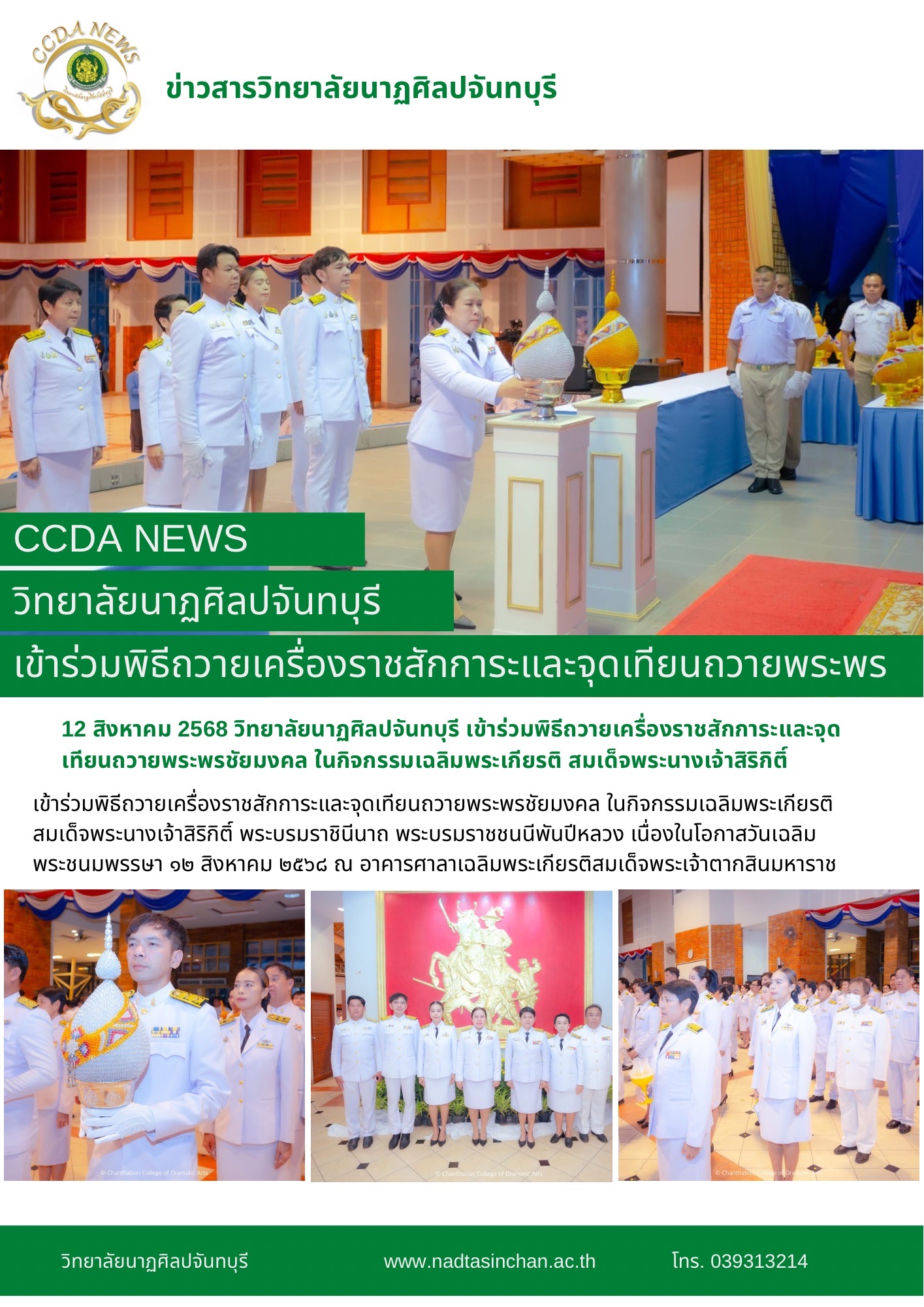 วิทยาลัยนาฏศิลปจันทบุรีเข้าร่วมพิธีถวายเครื่องราชสักการะและจุดเทียนถวายพระพรชัยมงคล ในกิจกรรมเฉลิมพระเกียรติ สมเด็จพระนางเจ้าสิริกิติ์ พระบรมราชินีนาถ พระบรมราชชนนีพันปีหลวง เนื่องในโอกาสวันเฉลิมพระชนมพรรษา ๑๒ สิงหาคม ๒๕๖๘ ณ อาคารศาลาเฉลิมพระเกียรติสมเด็จพระเจ้าตากสินมหาราช