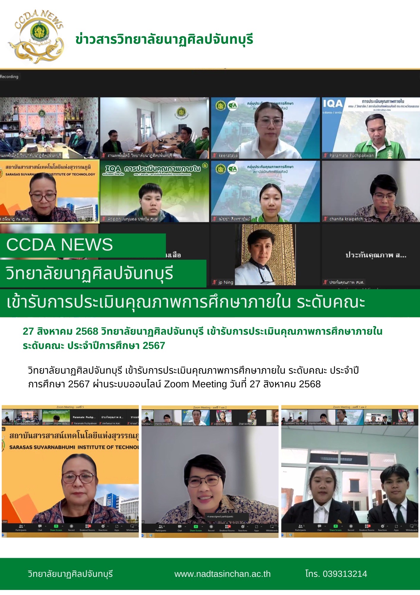 วิทยาลัยนาฏศิลปจันทบุรี เข้ารับการประเมินคุณภาพการศึกษาภายใน ระดับคณะ ประจำปีการศึกษา 2567 ผ่านระบบออนไลน์ Zoom Meeting วันที่ 27 สิงหาคม 2568