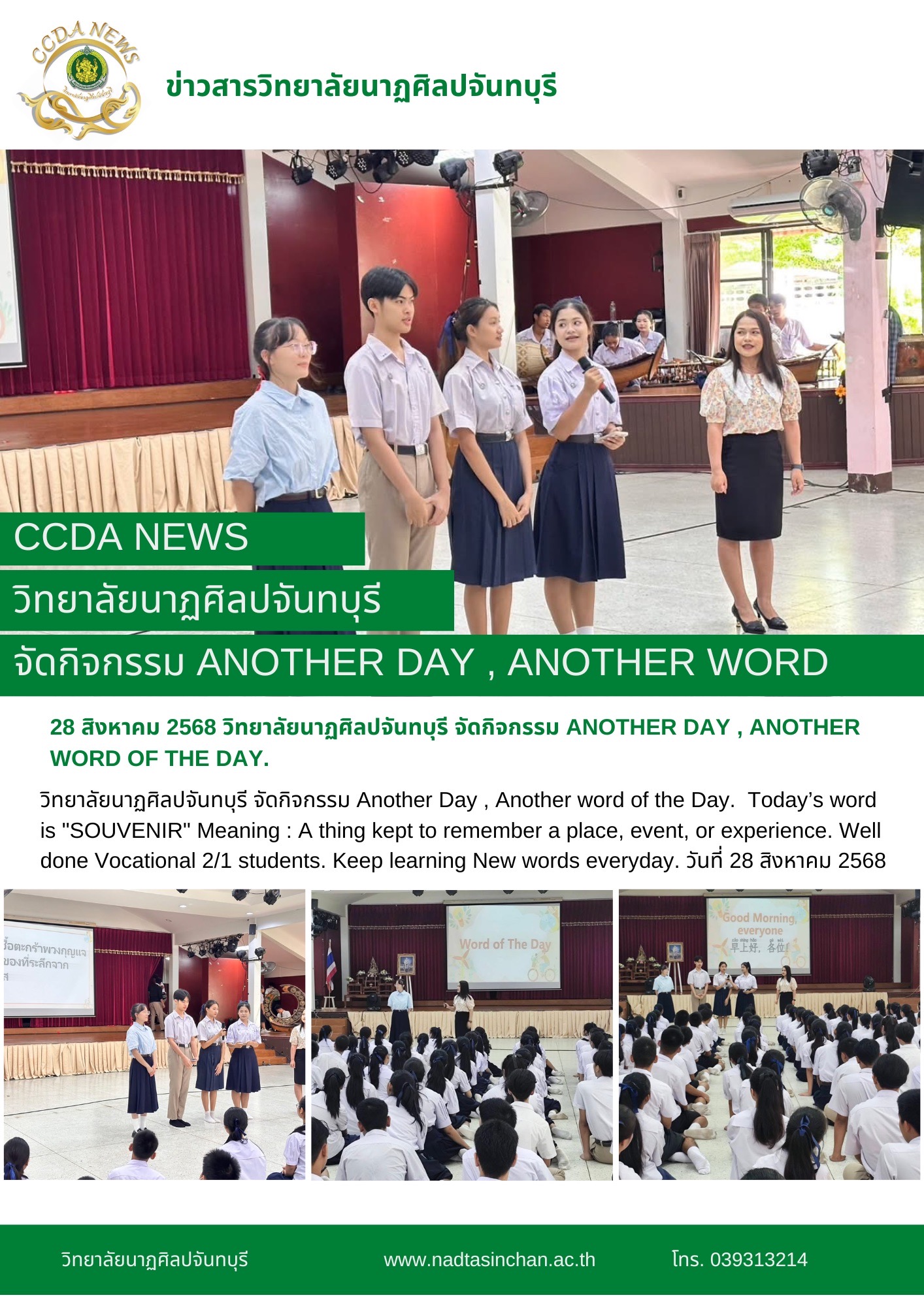 วิทยาลัยนาฏศิลปจันทบุรี จัดกิจกรรม Another Day , Another word of the Day.  Today’s word is "SOUVENIR" Meaning : A thing kept to remember a place, event, or experience. Well done Vocational 2/1 students. Keep learning New words everyday. วันที่ 28 สิงหาคม 2568