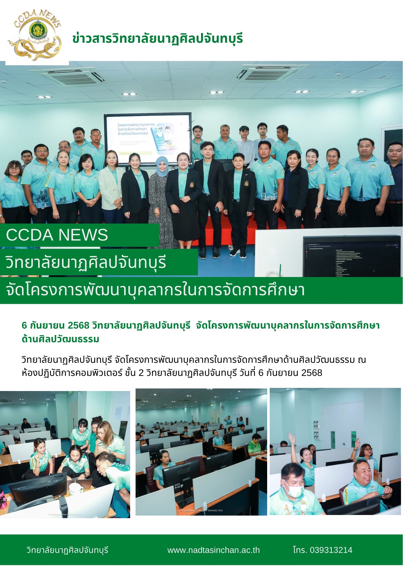 วิทยาลัยนาฏศิลปจันทบุรี จัดโครงการพัฒนาบุคลากรในการจัดการศึกษาด้านศิลปวัฒนธรรม ณ ห้องปฏิบัติการคอมพิวเตอร์ ชั้น 2 วิทยาลัยนาฏศิลปจันทบุรี วันที่ 6 กันยายน 2568