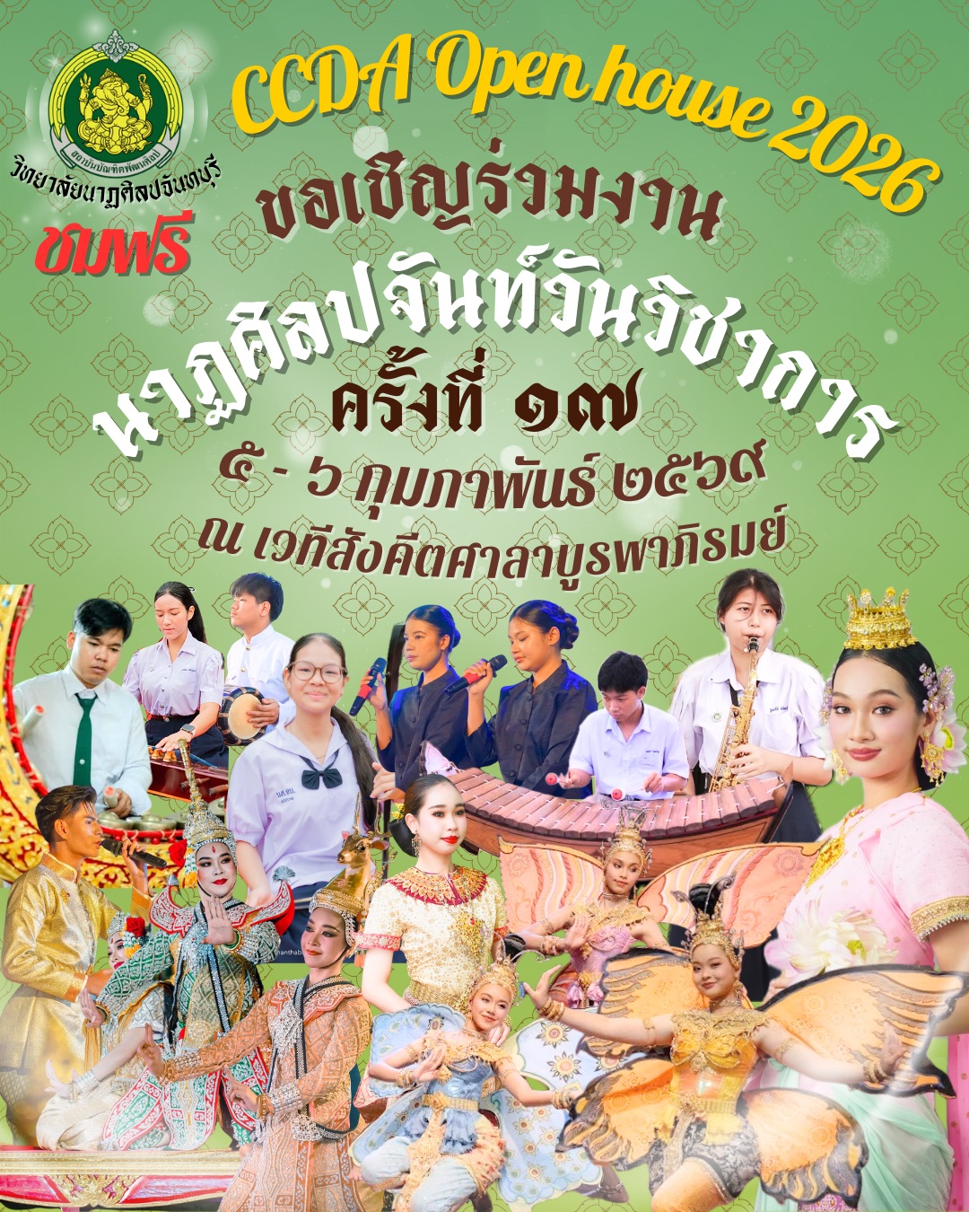 ขอเชิญ ทุกท่านรับชมการแสดงตลอด 2 วัน ในวันที่ 5 กุมภาพันธ์ 2569 เวลา 08.30-21.00 น. และวันที่ 6 กุมภาพันธ์ 2569 เวลา 08.30-16.00 น. เนื่องในงาน นาฏศิลปจันท์วันวิชาการ ครั้งที่ 17 และกิจกรรมเปิดบ้านวิทยาลัยนาฏศิลปจันทบุรี โดยในงานจะมีการจัดนิทรรศการการศึกษา การนำเสนอต่างๆเกี่ยวกับการจัดการศึกษาภายในวิทยาลัยนาฏศิลปจันทบุรี นักเรียนที่สนใจจากโรงเรียนต่างๆ ที่ต้องการทราบการจัดการเรียนการสอนสามารถเดินทางมาชมได้ รวมถึงประชาชนทั่วไปที่ต้องการชมการแสดงสามารถเดินทางมาชมได้ตามวันและเวลาข้างต้น ย้ำว่า “ชมฟรี“ ตลอดทั้ง 2 วัน ในส่วนของนักเรียนที่สนใจสมัครเรียน ชั้นมัธยมศึกษาปีที่ 1 และ ชั้นประกาศนียบัตรวิชาชีพปีที่ 1 หรือระดับปริญญาตรี ถ้าสมัครในวันงาน วิทยาลัยฯมีโควตารอบพิเศษให้ แล้วพบกัน #นาดสินจัน
